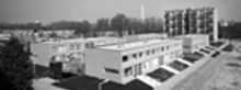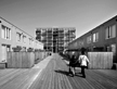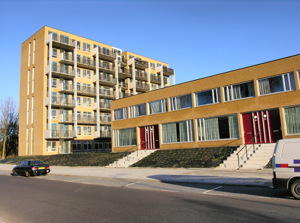 Optimistische hoogbouw en laagbouw, gezamenlijk op een terp gelegen, waarin de parkeergarage is verstopt. Daar bovenop een groot alles verbindend houten dek.