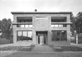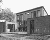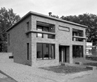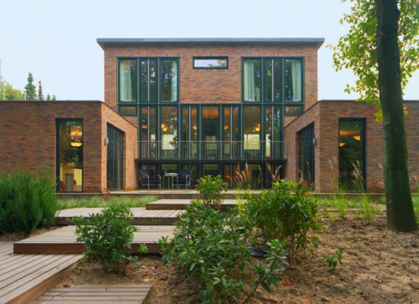 Symmetrie als middel om statigheid te bereiken. Rustige, plastische gevel aan de formele zijde. Versterkt door terrazzo dak-balkonrand en entreeluifel. Achtergevel heeft een imposante, drie verdiepingen hoge stalen gevel richting het bos. Twee salons lopen over in een brede lounge aan de achterzijde. Deze is weer verbonden, met de lager gelegen, uitstekende volumes.