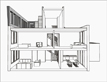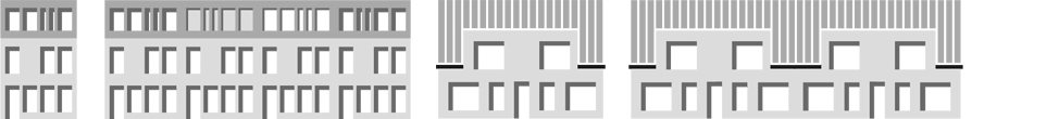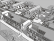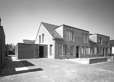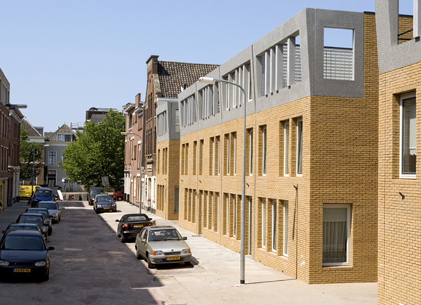Kleinschalige hofjes in contrast met het grote bouwblok. De hofjes hebben een dorpse sfeer door de kwartetwoningen met brede voortuinen. Flexibiliteit is het thema voor de stadswoningen. De stedenbouwkundig vereiste derde laag wordt beperkt ingevuld. De lichte trapombouw is een eerste aanzet tot zelfbouwactiviteiten. De formele schijngevel schermt deze af van de straat. |