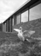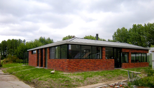 Boerenvilla op een terp. U-vormig, waardoor middenin een beschutte patio ontstaat als contrast met het wijdse land. Verstoorde symmetrie door ongelijke borstwerings-hoogtes onder panoramische hoekramen. Platte kap veroorzaakt origamische plafonds.