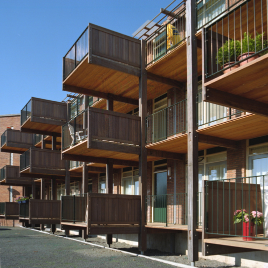 Compact ouderenblokje, twaalf woningen met lift en rustige parkeertuin. Panoramisch door gevelbrede woonkamers met grote ramen. Flexibel te gebruiken plattegrond met veel deuren naar houten galerij, waaraan een houten balkon. Trappenhuis maakt stedenbouwkundige aansluiting en bevat opmerkelijke akoestische wand.