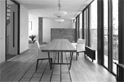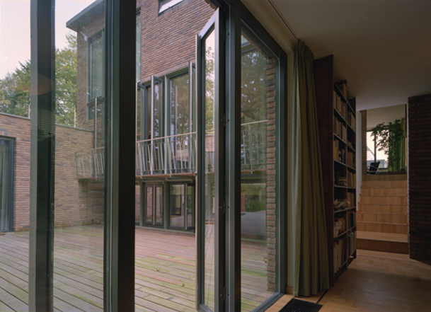 Symmetrie als middel om statigheid te bereiken. Rustige, plastische gevel aan de formele zijde. Versterkt door terrazzo dak-balkonrand en entreeluifel. Achtergevel heeft een imposante, drie verdiepingen hoge stalen gevel richting het bos. Twee salons lopen over in een brede lounge aan de achterzijde. Deze is weer verbonden, met de lager gelegen, uitstekende volumes.